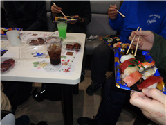 会場は蒲田駅前に新しく出来た「カラオケBANBAN」さん。ソフトドリンクバーとソフトクリームバーがあり、持ち込みもOKなお店です。ちょっと贅沢してお寿司とチキンを用意しました。初めてのお店と、久しぶりの懇親会に、みんな右往左往(汗)「まずは、入室前にグループ分けのくじを引いてくださーい。ランチョンマットを敷いて、お寿司を並べて、あ、お箸も…あああああ、みんな自分の飲み物をドリンクバーに取りに行ってーーーーー!!(たまご)」。そんな横では、先日の日帰り研修のビデオ鑑賞準備に汗だくな(ぐんまちゃん)さん。みんなドリンクバーに集中したので、売り切れが続出!!(カニすきヨ)さんが、店員さんのもとに走ります(汗)そんなバタバタが30分ほど続いて、やっとカンパーイ!!お腹ペコペコで美味しいお寿司がより一層おいしく感じました。