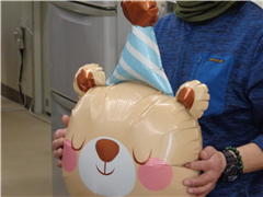 司会の(ジャーニー)さんの声掛けで、会場はいつの間にか満席に…。拍手で(しめじ)さんを迎えます。早速、「くまイク(くまのバルーン)」をマイク代わりに、1人ずつ贈る言葉です。心のこもった言葉を贈るうちに、感極まる人多数。さらに(しめじ)さんが各テーブルを回って、歓談。「最後の日だというのに、それセクハラ~」との声で、自ら反省(正座)の人アリです(´艸`*)